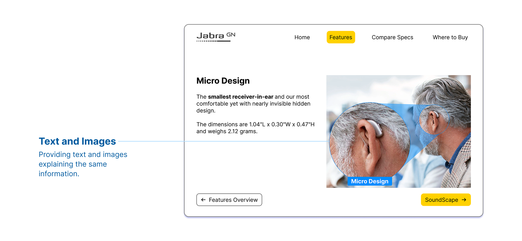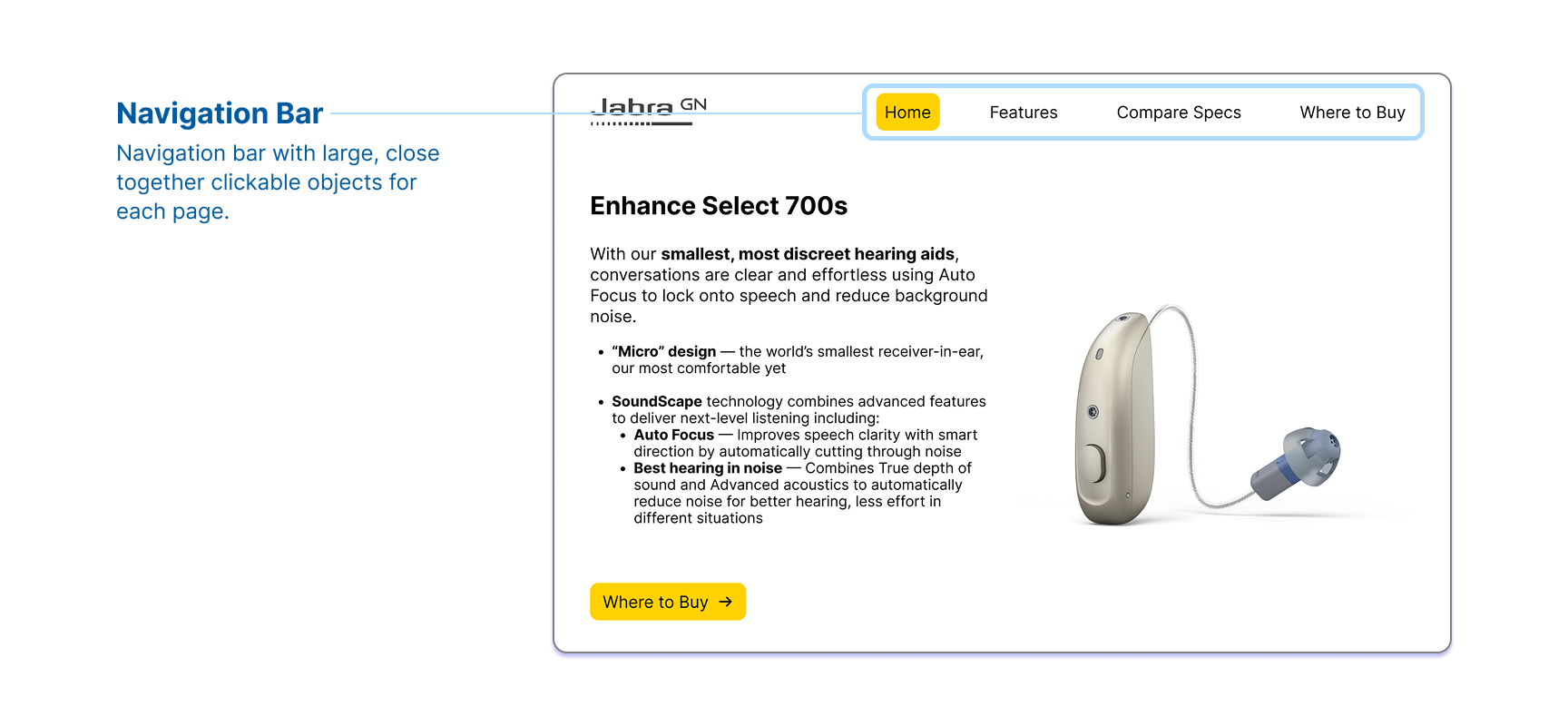 For my final project, I created an educational promotion page for the Jabra Enhance Select 700 Hearing Aids. The prototype is broken down into 4 main pages that contain essential information about the product. The "Home" page is where the user lands when investigating the product to access main information. The "Features" page contains all of the main features of the hearing aids with informative graphic. The "Compare Specs" page compares the Enhance Select 700s and the Enhance Select 300s. Finally, the "Where to Buy" page lists all the places where the user can get the product.