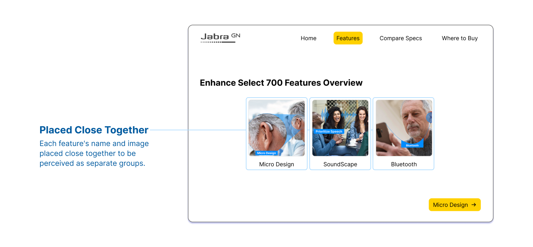 The Law of Proximity says items that are close in distance are perceived as a group in the user's mind. For the “Features” page, each feature's name, image, and description will be placed close together; making each feature perceived as separate groups.