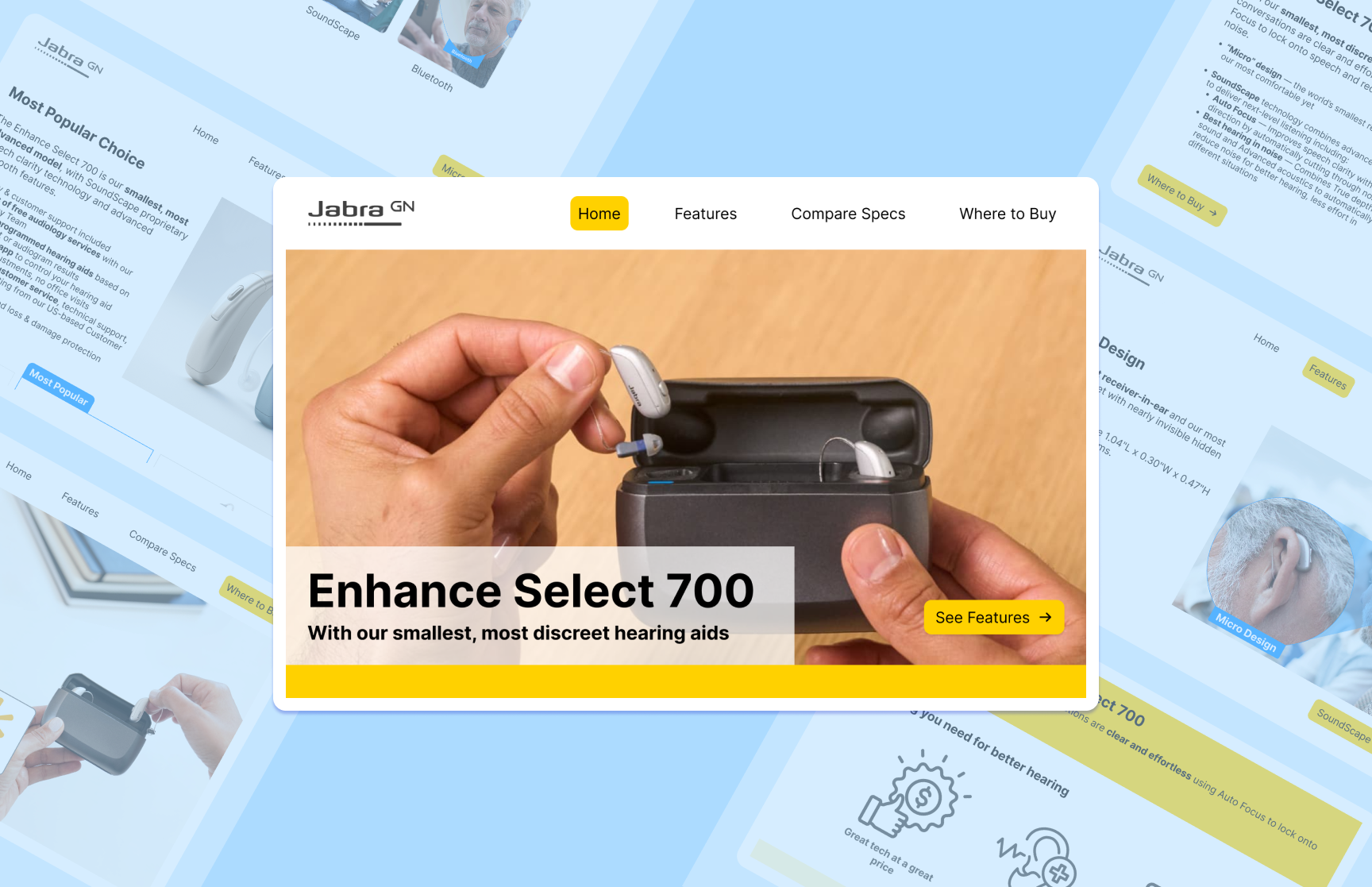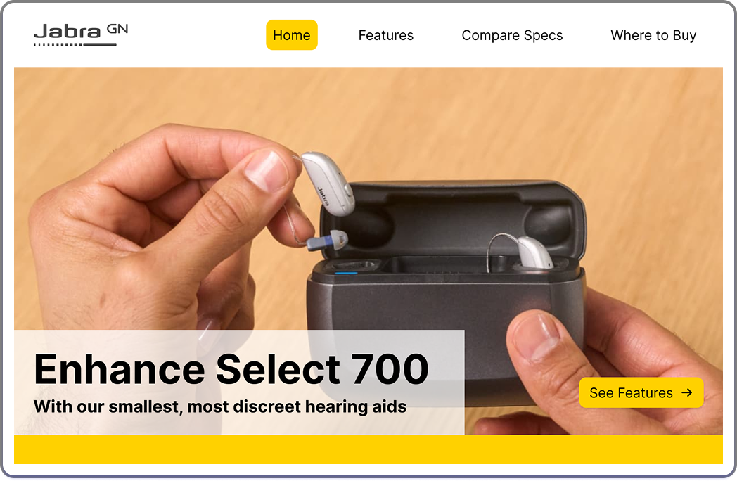 I was tasked with creating a promotional website for the Jabra Enhance Select 700 Hearing Aids while being guided by different user interface laws and principles of design. The goal of the website is to educate users on the features and to allow them to see if these are the hearing aids for their needs.
