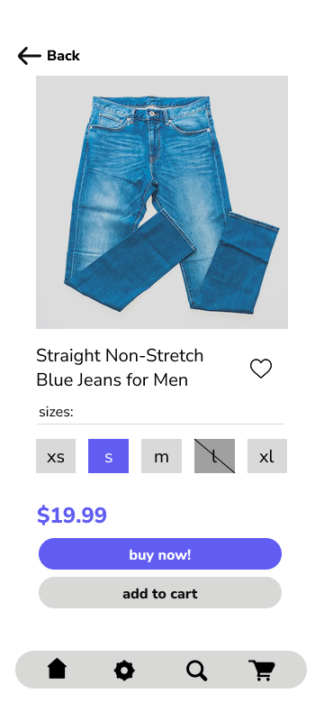 Item Screen: For the item screen I tried to make it look like a mix of what I saw on Old Navy and Amazon.