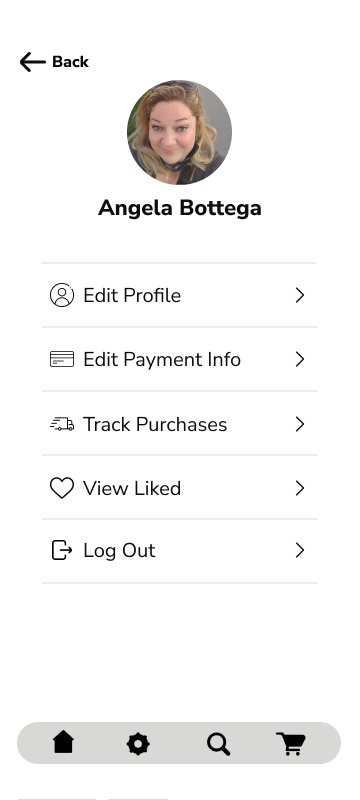 Profile Settings: When making the profile settings, I was thinking of the Amazon app and tried to incorporate the tracking for the shipments and I also thought, instead of a Wishlist I could add something like a liked list similar to TikTok.