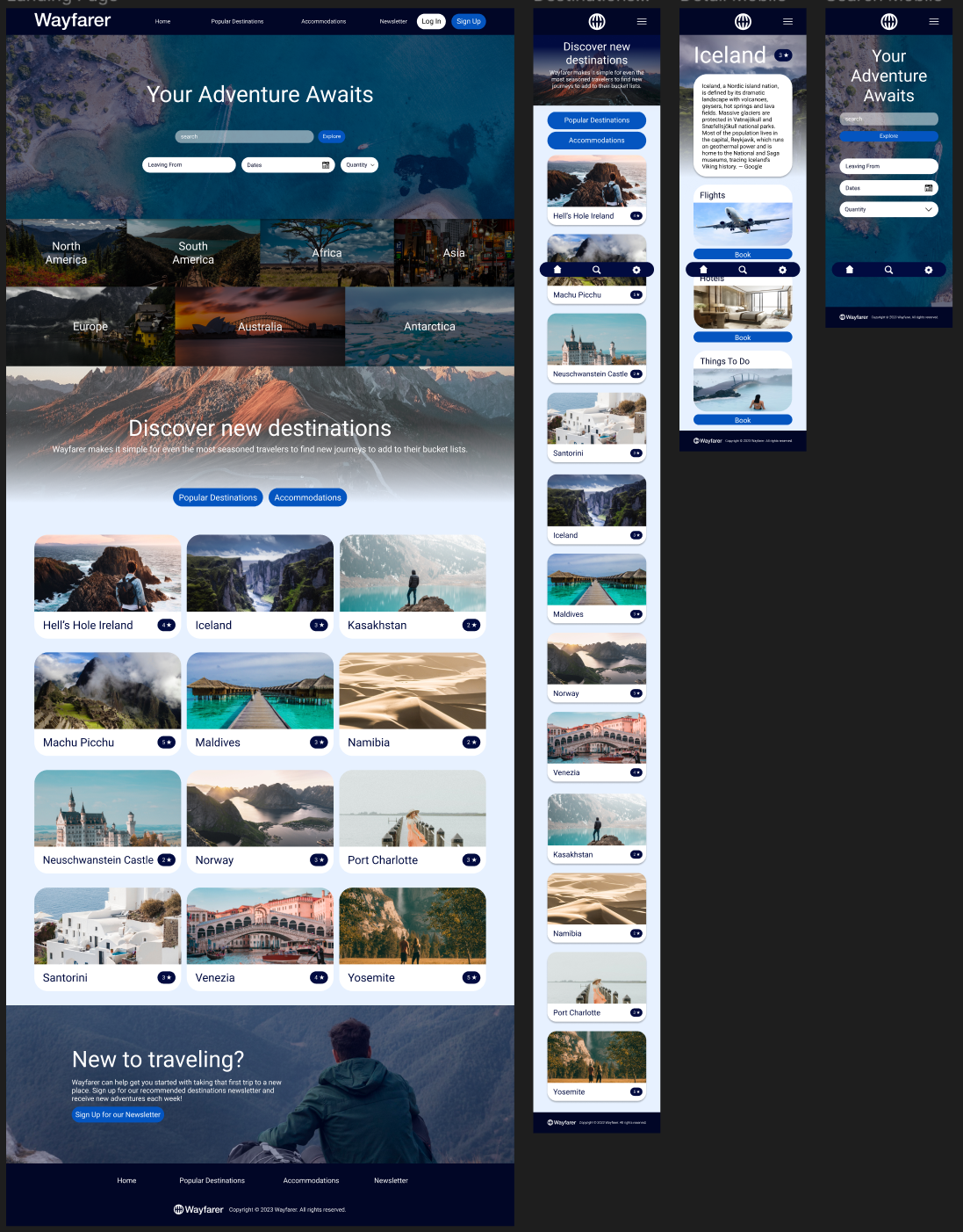 (I wanted the website to exude security and adventure; therefore, I incorporated a lot of blues and pictures of destinations that users may associate with "adventure" ).
